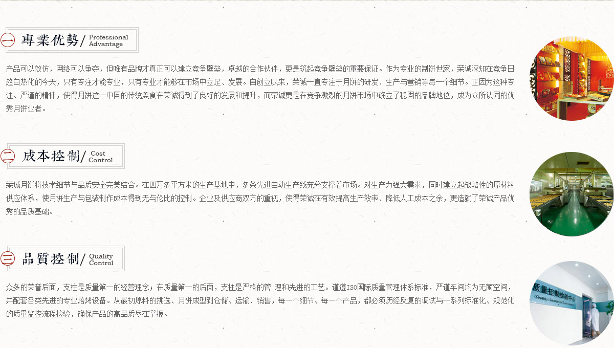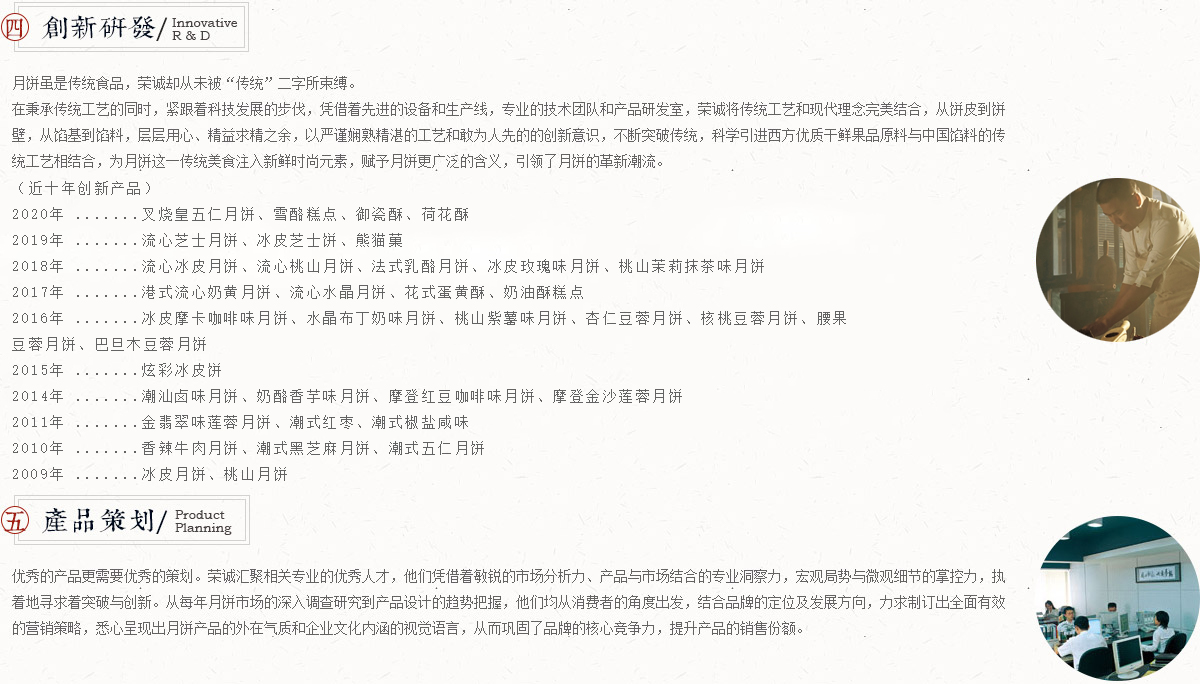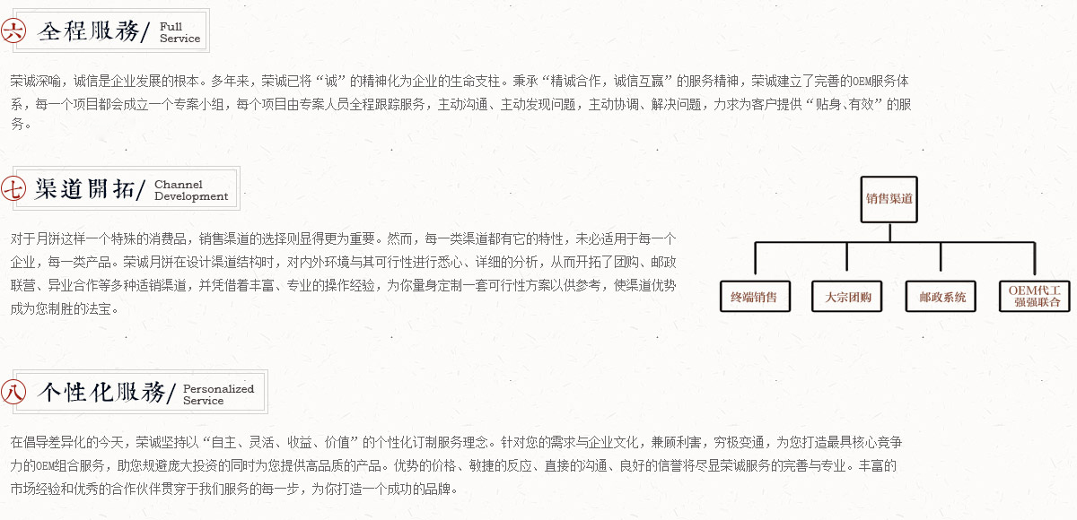 榮誠作為一家高標(biāo)準(zhǔn)、規(guī)范化、規(guī)?;膶I(yè)烘焙生產(chǎn)企業(yè),依靠強大的專業(yè)能力,每年可為上千家企業(yè)提供形式靈活、創(chuàng)意時尚的個性化定制服務(wù),業(yè)務(wù)類型覆蓋:合作授權(quán)定制、酒店禮食定制、渠道創(chuàng)意定制、集團福利個性化定制、跨界聯(lián)名定制等各式各樣的定制需求。榮誠與多個省市的中國郵政、中國聯(lián)通等大型企業(yè)單位建立長期合作,提供專屬定制禮食產(chǎn)品,接受客戶及第三方檢測機構(gòu)的專業(yè)嚴(yán)格驗廠。在渠道端二十多年的市場耕耘,榮誠與沃爾瑪、大潤發(fā)、世紀(jì)聯(lián)華等各大連鎖KA賣場建立穩(wěn)定的合作,產(chǎn)品與服務(wù)獲得消費者的廣泛認(rèn)可。