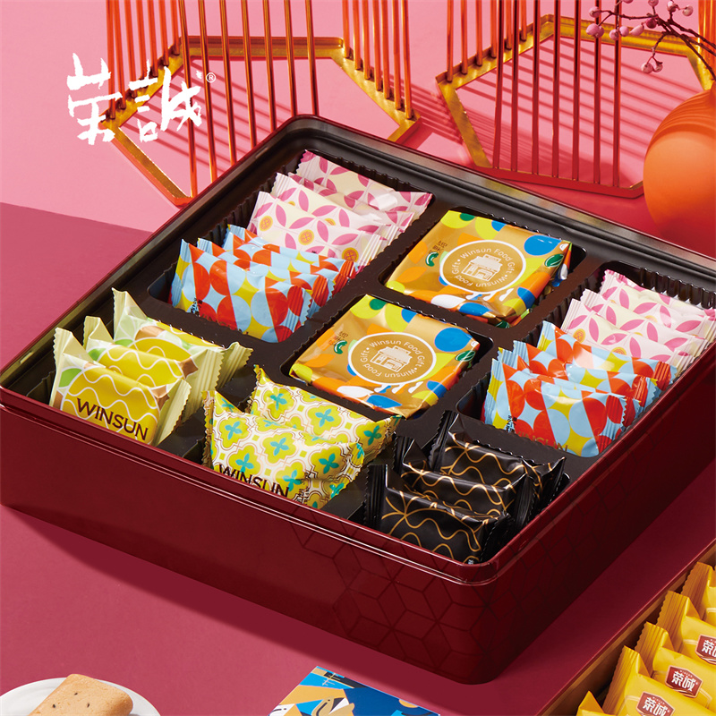 【編 碼】 CGT2208 【條形碼】 6925755534508 【尺 寸】 29.8x29.8x14.3cm 【凈含量】 845g 【規(guī) 格】 845gx4盒/箱 【內(nèi)容物】 100g綜合果仁x1,48g櫻花荔枝味曲奇x1,30g堅果撻x2,35g特色果仁腐乳餅x2,8g果仁曲奇x8,10g香焙杏仁酥x8,30g香妃鳳梨酥x3,30g黑金鳳梨酥x3,13.5g澳式金泊雞蛋卷(咸蛋黃)x9,13.5g澳式金泊雞蛋卷(芝麻原味)x9