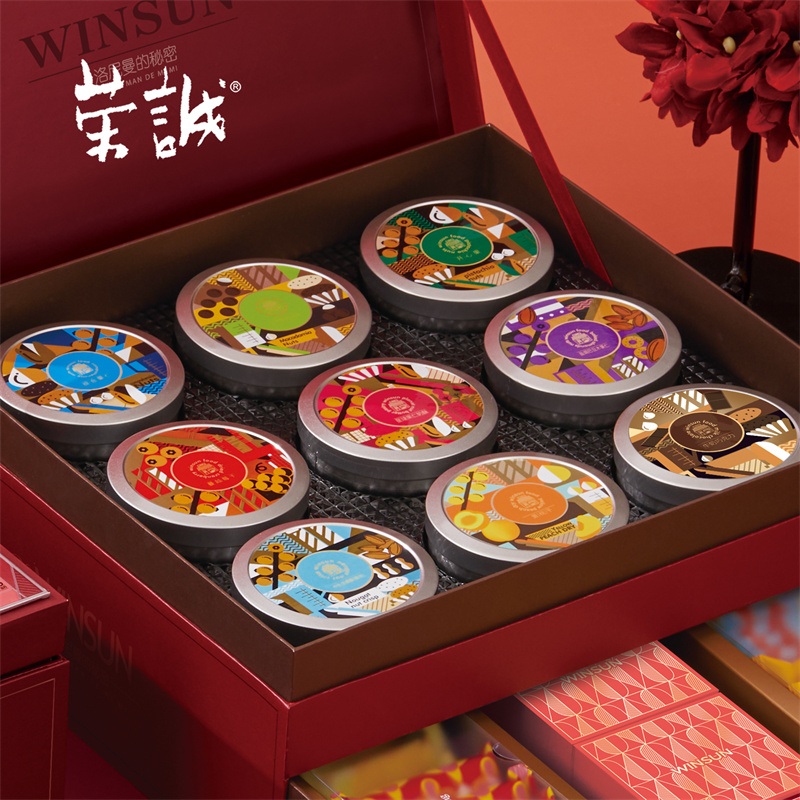 100g奶香味夏威夷果x1,100g開心果x1,100g鹽焗巴旦木果仁x1,70g黃桃干x1,100g星球果仁奶酥x1,88g牛軋堅果酥(原味)x1,48g牛奶巧克力x1,100g蔓越莓干x1,100g綜合果仁x1,30g堅果撻x2,35g特色果仁腐乳餅x4,30g黑金鳳梨酥x3,30g香妃鳳梨酥x3,11g原味蝴蝶酥x6,10g香焙花生酥x6,8g果仁曲奇x6,13.5g澳式金泊雞蛋卷(咸蛋黃)x5