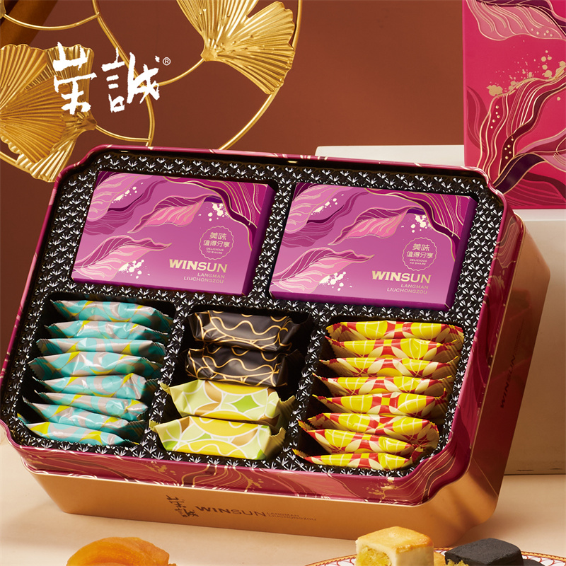 100g綜合果仁x1,70g黃桃干x1,8g原味奶油曲奇x8,10g椰蓉奶酥x8,30g香妃鳳梨酥x2,30g黑金鳳梨酥x2,10g香焙黑芝麻酥x8,10g香焙蔓越莓酥x7,13.5g澳式金泊雞蛋卷(芝麻原味)x8,12g蔥香卡拉棒x8